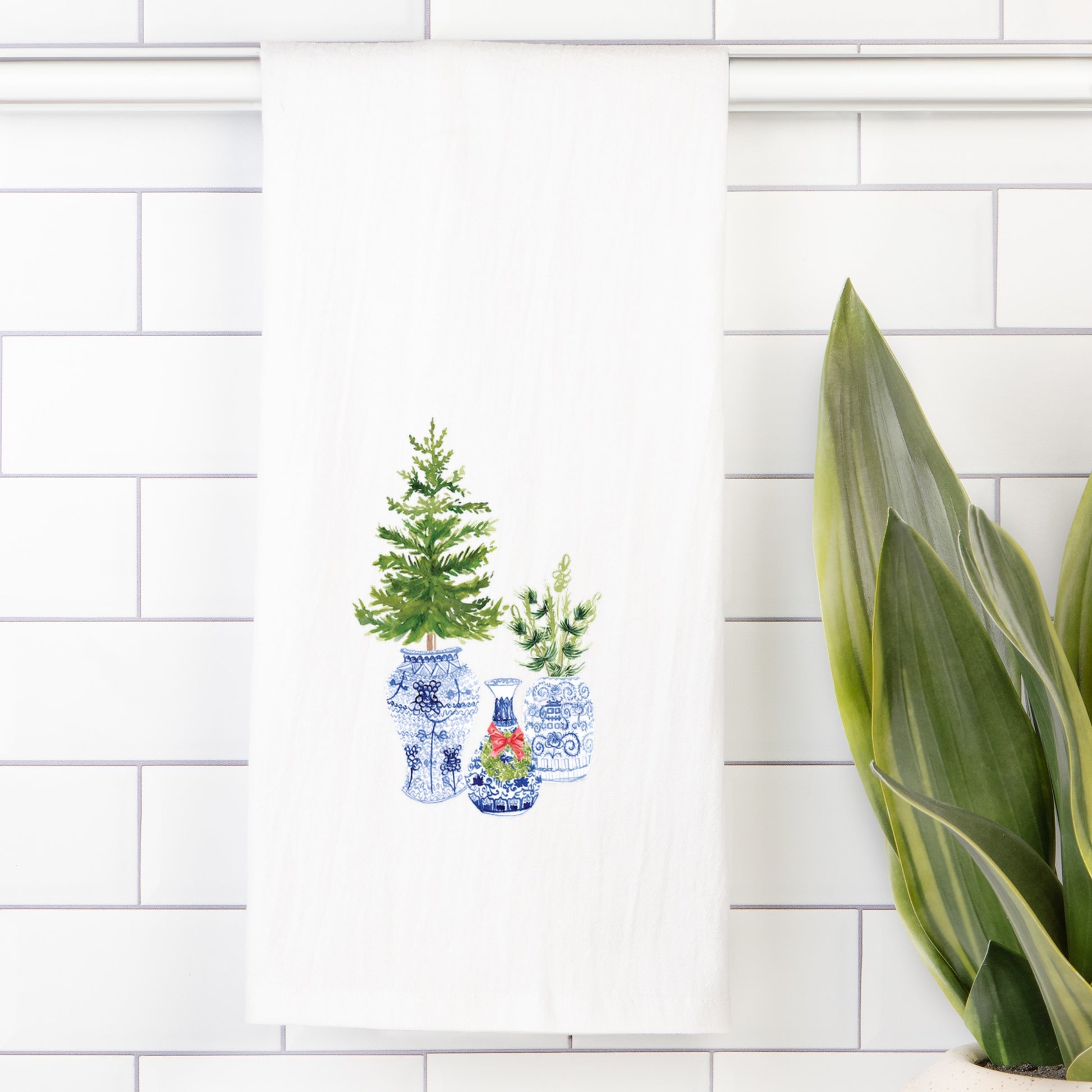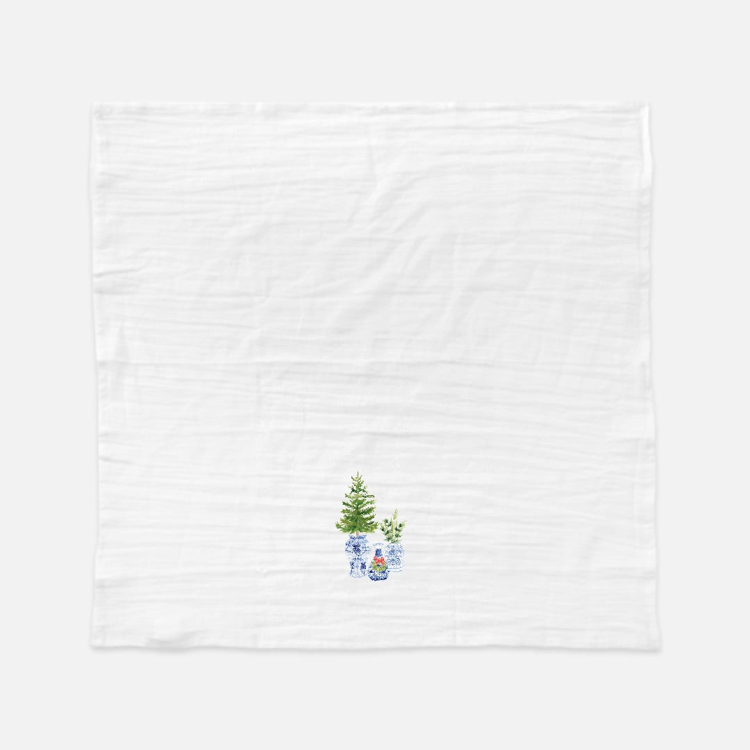 Classic chinoiserie meets holiday charm in this elegant Ginger Jar Christmas tea towel. Featuring hand-painted watercolor designs of blue and white ginger jars filled with festive evergreens, this towel brings a timeless touch of style to your seasonal décor.